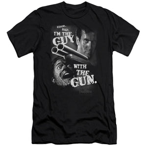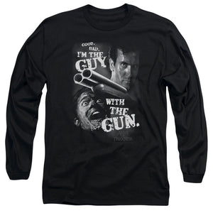 ARMY OF DARKNESS GUY WITH THE GUN ADULT UNISEX HEATHER PULLOVER HOODIE IN BLACK COLORWAY