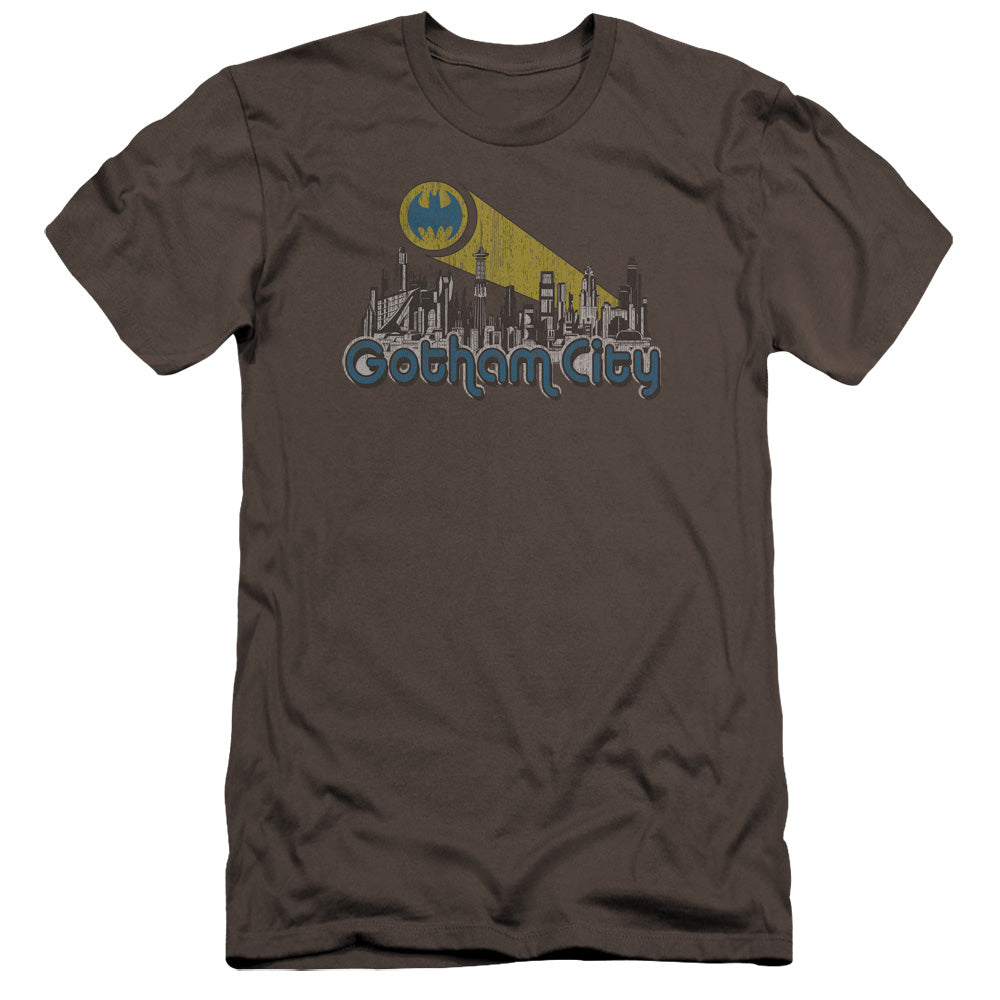 - BATMAN GOTHAM CITY DISTRESSED MEN'S PREMIUM SLIM FIT T-SHIRT IN CHARCOAL COLORWAY with a timeless design that makes a true fan statement.