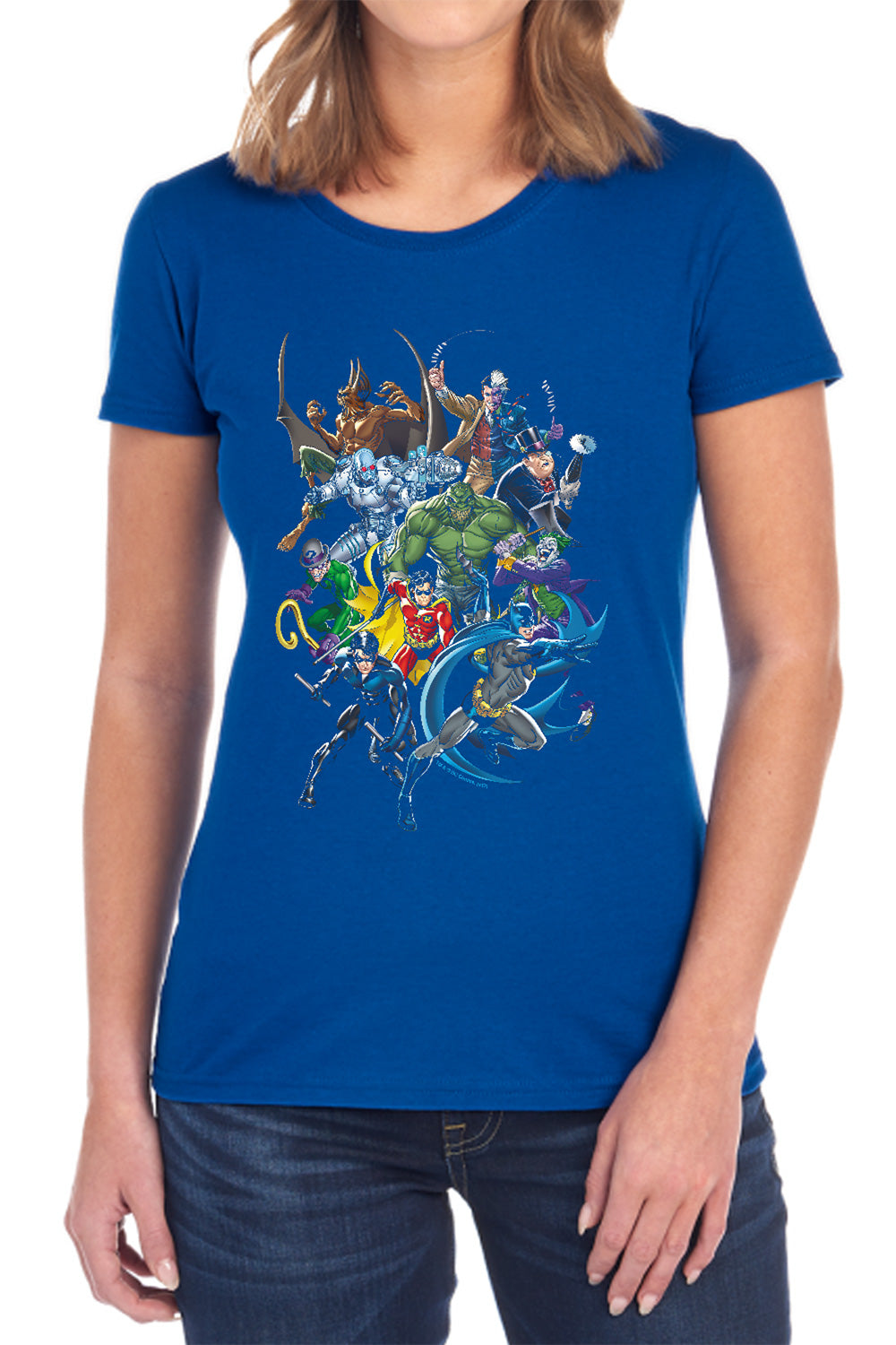 The BATMAN SAINTS AND PSYCHOS WOMEN'S REGULAR FIT T-SHIRT IN BLACK COLORWAY offers a flattering cut and classic style that fans will love to wear.