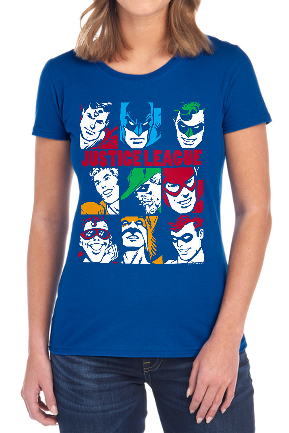 - DC NINE BLOCKS OF JUSTICE WOMEN'S REGULAR FIT T-SHIRT IN BLACK COLORWAY with a timeless design that makes a true fan statement.