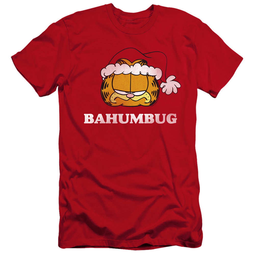 - GARFIELD BAHUMBUG MEN'S PREMIUM SLIM FIT T-SHIRT IN RED COLORWAY with a timeless design that makes a true fan statement.