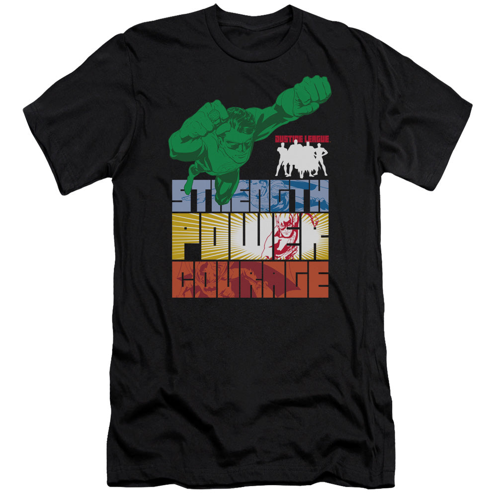 - JLA HEROIC QUALITIES MEN'S PREMIUM SLIM FIT T-SHIRT IN BLACK COLORWAY with a timeless design that makes a true fan statement.